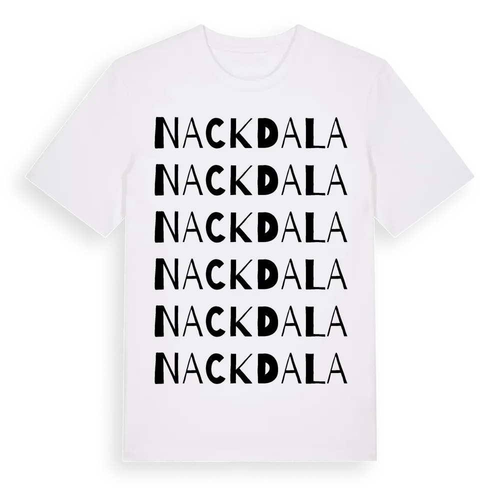 Nackdala ordlek t-shirt är inspirerad av stadsdelen Nackdala i Stockholms län, Sverige. Tröjan är designad för dig som har en speciell koppling till platsen – oavsett om du bor här, har rötterna här eller bara älskar Nackdala.