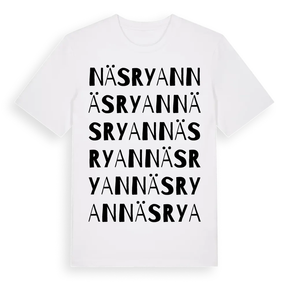 Näsryan ordlek t-shirt är inspirerad av Näsryan i Stockholms län, Sverige. Tröjan är designad för dig som har en speciell koppling till platsen – oavsett om du bor här, har rötterna här eller bara älskar Näsryan.