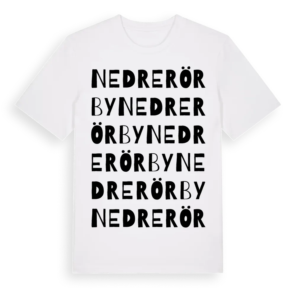 Nedre Rörby ordlek t-shirt är inspirerad av Nedre Rörby i Stockholms län, Sverige. Tröjan är designad för dig som har en speciell koppling till platsen – oavsett om du bor här, har rötterna här eller bara älskar Nedre Rörby.