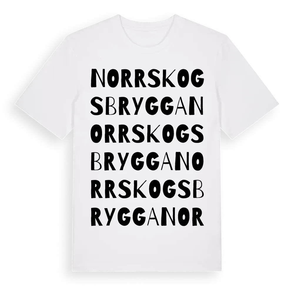 Norrskogs Brygga ordlek t-shirt är inspirerad av byn Norrskogs Brygga i Stockholms län, Sverige. Tröjan är designad för dig som har en speciell koppling till platsen – oavsett om du bor här, har rötterna här eller bara älskar Norrskogs Brygga.