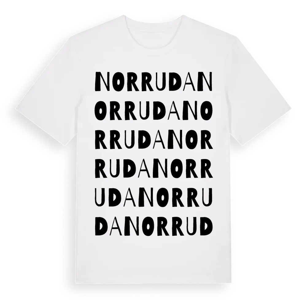 Norruda ordlek t-shirt är inspirerad av Norruda i Stockholms län, Sverige. Tröjan är designad för dig som har en speciell koppling till platsen – oavsett om du bor här, har rötterna här eller bara älskar Norruda.