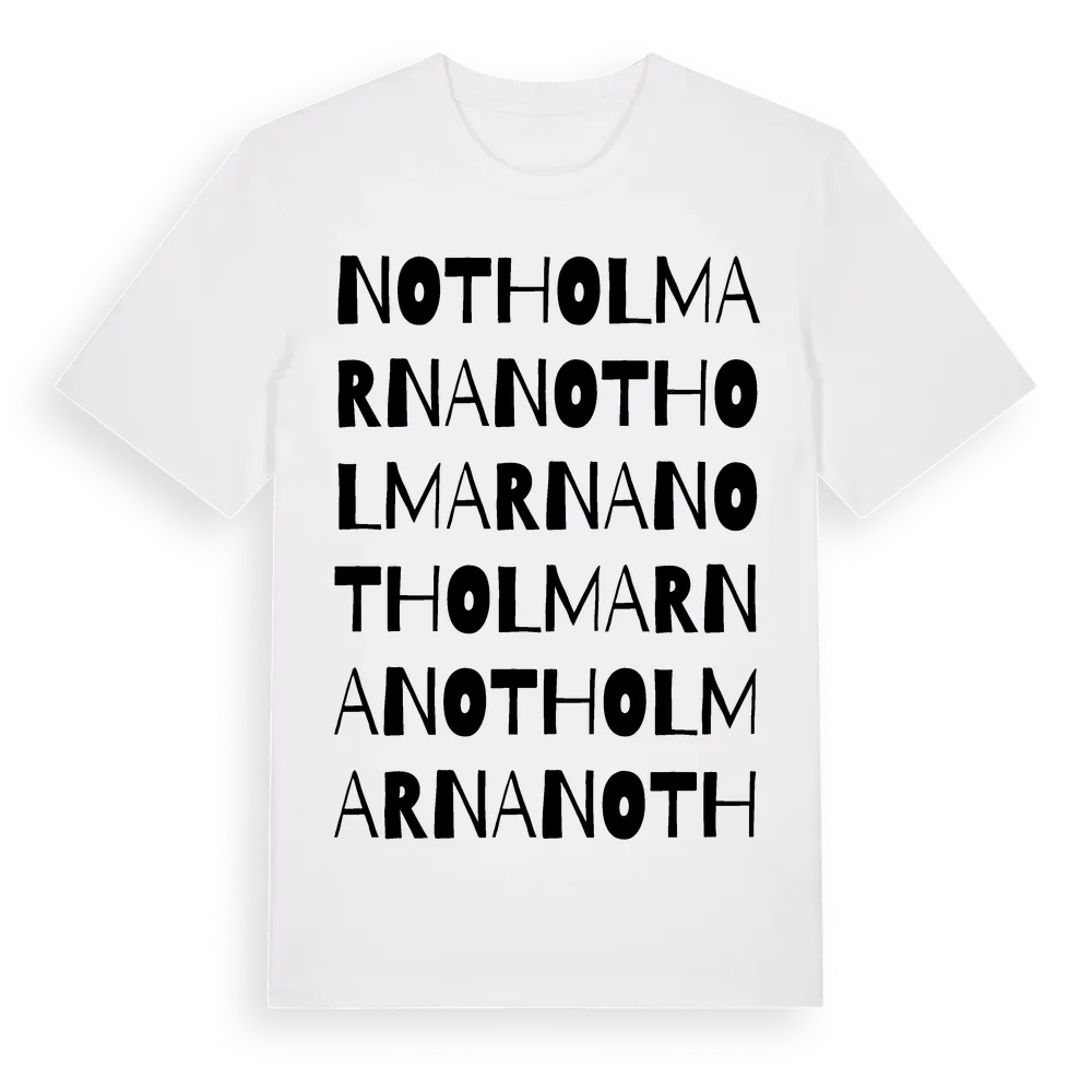 Notholmarna ordlek t-shirt är inspirerad av Notholmarna i Stockholms län, Sverige. Tröjan är designad för dig som har en speciell koppling till platsen – oavsett om du bor här, har rötterna här eller bara älskar Notholmarna.