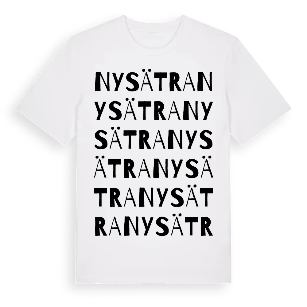 Nysätra ordlek t-shirt är inspirerad av Nysätra i Stockholms län, Sverige. Tröjan är designad för dig som har en speciell koppling till platsen – oavsett om du bor här, har rötterna här eller bara älskar Nysätra.