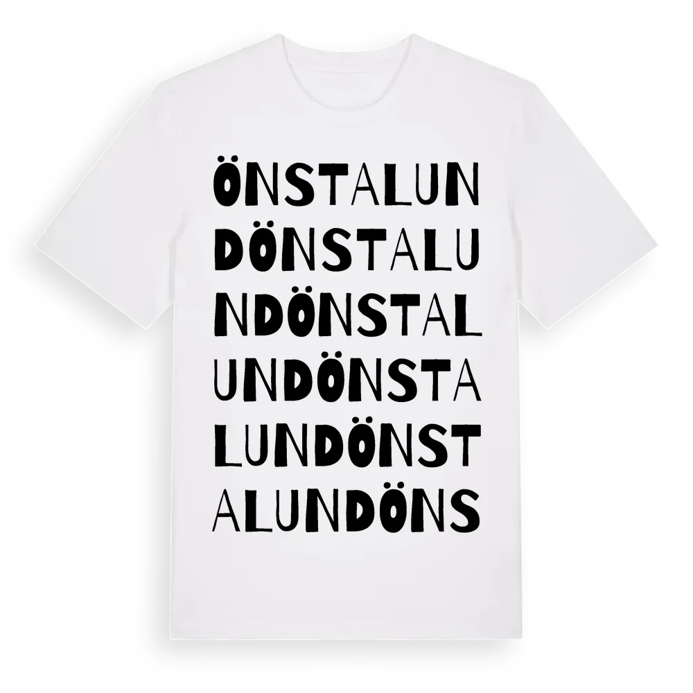 Önstalund ordlek t-shirt är inspirerad av Önstalund i Stockholms län, Sverige. Tröjan är designad för dig som har en speciell koppling till platsen – oavsett om du bor här, har rötterna här eller bara älskar Önstalund.