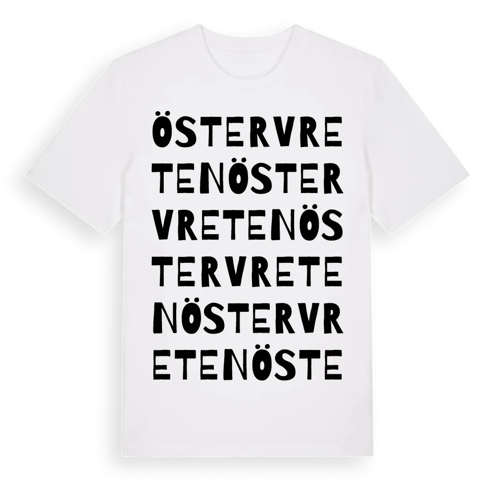 Östervreten ordlek t-shirt är inspirerad av Östervreten i Stockholms län, Sverige. Tröjan är designad för dig som har en speciell koppling till platsen – oavsett om du bor här, har rötterna här eller bara älskar Östervreten.