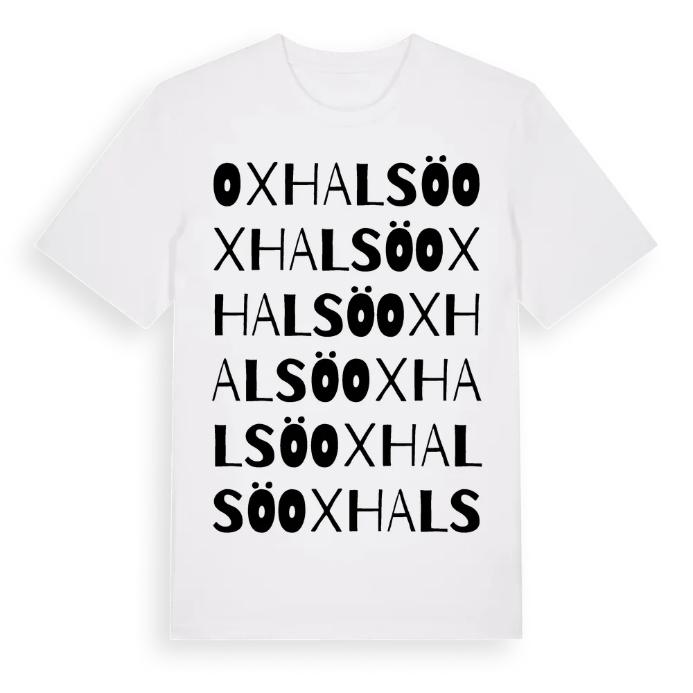 En ordlek byggd på Oxhalsös namn. Subtilt och klurig – ett motiv som bara de som verkligen känner platsen fullt ut förstår. Premium bomull, unisex – från byn Oxhalsö i Stockholms län.