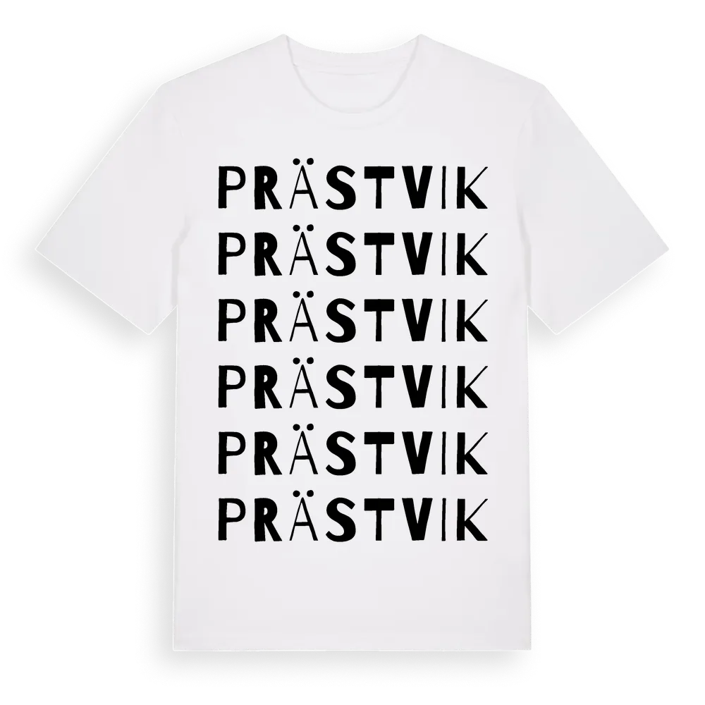 Prästvik ordlek t-shirt är inspirerad av byn Prästvik i Stockholms län, Sverige. Tröjan är designad för dig som har en speciell koppling till platsen – oavsett om du bor här, har rötterna här eller bara älskar Prästvik.