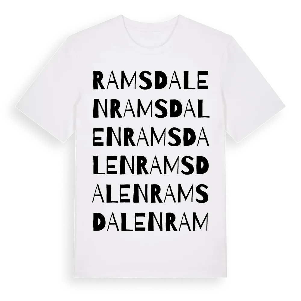 Ramsdalen ordlek t-shirt är inspirerad av byn Ramsdalen i Stockholms län, Sverige. Tröjan är designad för dig som har en speciell koppling till platsen – oavsett om du bor här, har rötterna här eller bara älskar Ramsdalen.