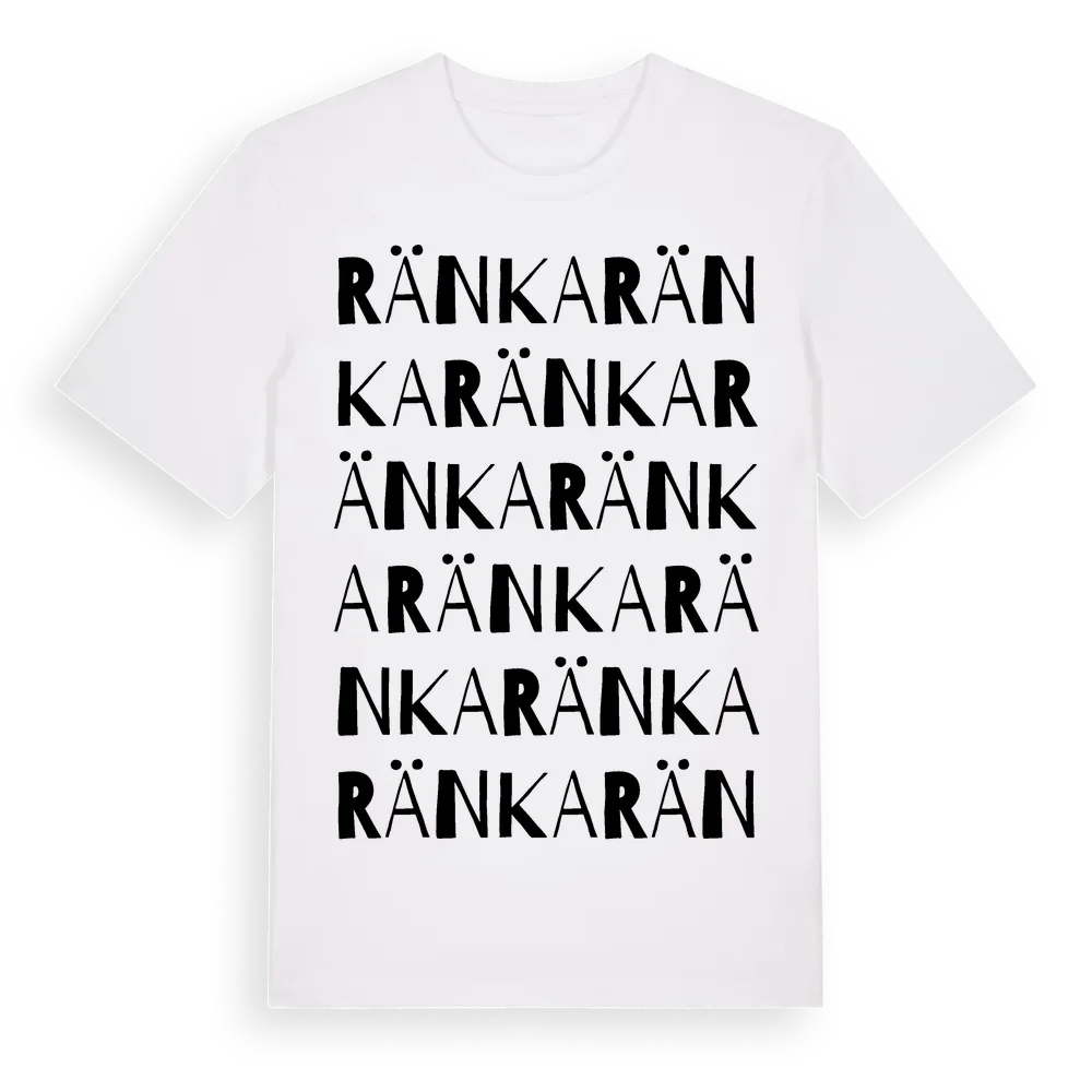 Ränka ordlek t-shirt är inspirerad av byn Ränka i Stockholms län, Sverige. Tröjan är designad för dig som har en speciell koppling till platsen – oavsett om du bor här, har rötterna här eller bara älskar Ränka.