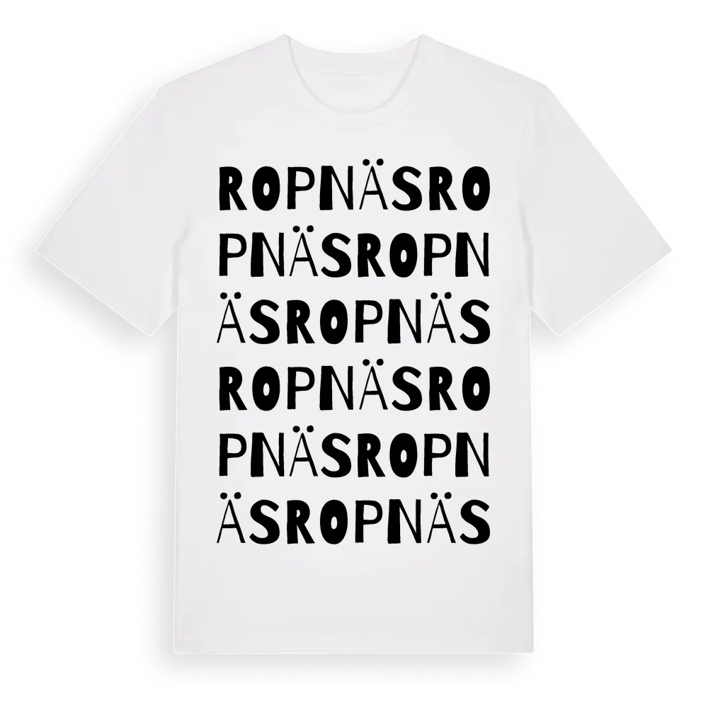 Ropnäs ordlek t-shirt är inspirerad av byn Ropnäs i Stockholms län, Sverige. Tröjan är designad för dig som har en speciell koppling till platsen – oavsett om du bor här, har rötterna här eller bara älskar Ropnäs.