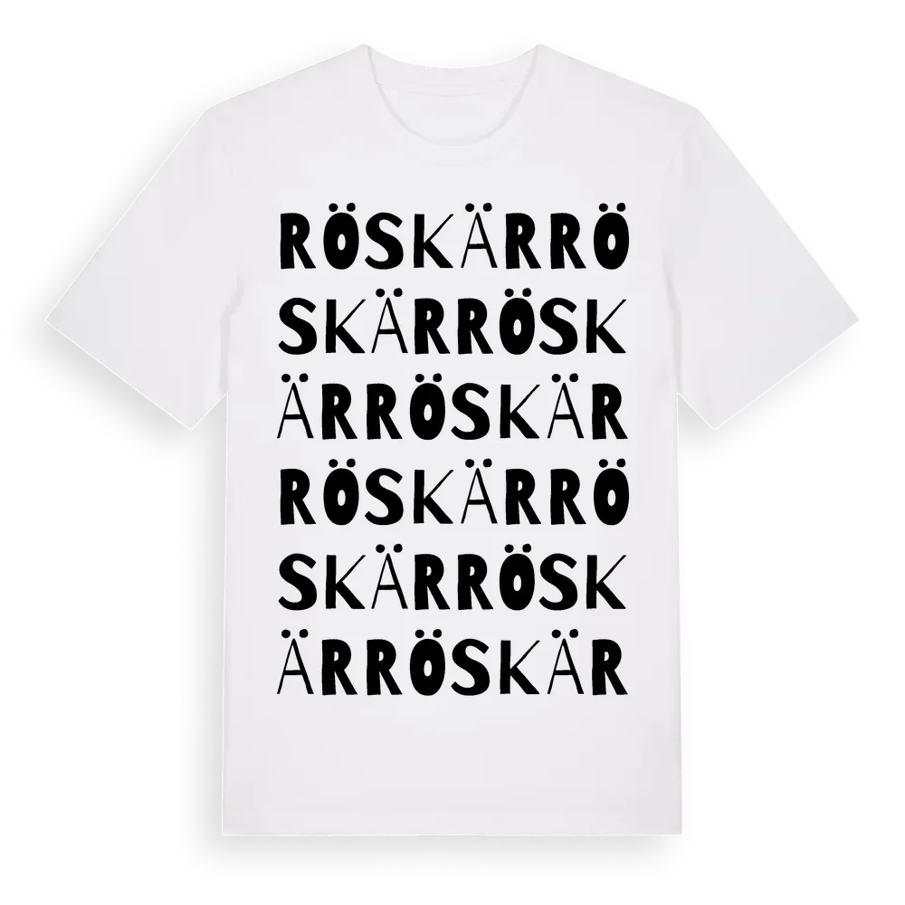 Röskär ordlek t-shirt är inspirerad av Röskär i Stockholms län, Sverige. Tröjan är designad för dig som har en speciell koppling till platsen – oavsett om du bor här, har rötterna här eller bara älskar Röskär.