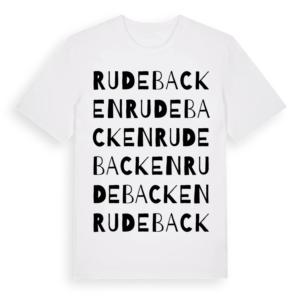 En ordlek byggd på Rudebackens namn. Subtilt och klurig – ett motiv som bara de som verkligen känner platsen fullt ut förstår. Premium bomull, unisex – från byn Rudebacken i Stockholms län.