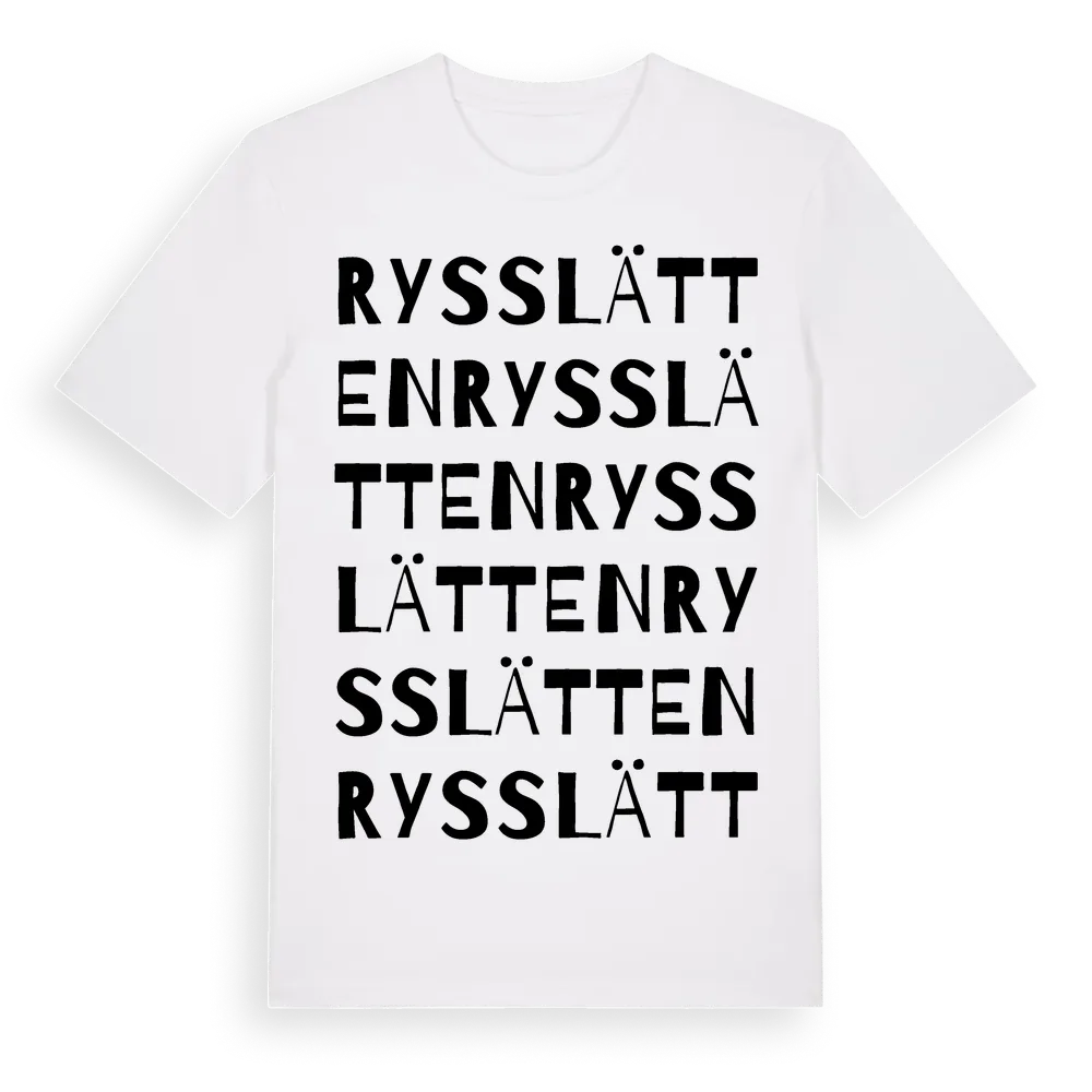 Rysslätten ordlek t-shirt är inspirerad av Rysslätten i Stockholms län, Sverige. Tröjan är designad för dig som har en speciell koppling till platsen – oavsett om du bor här, har rötterna här eller bara älskar Rysslätten.