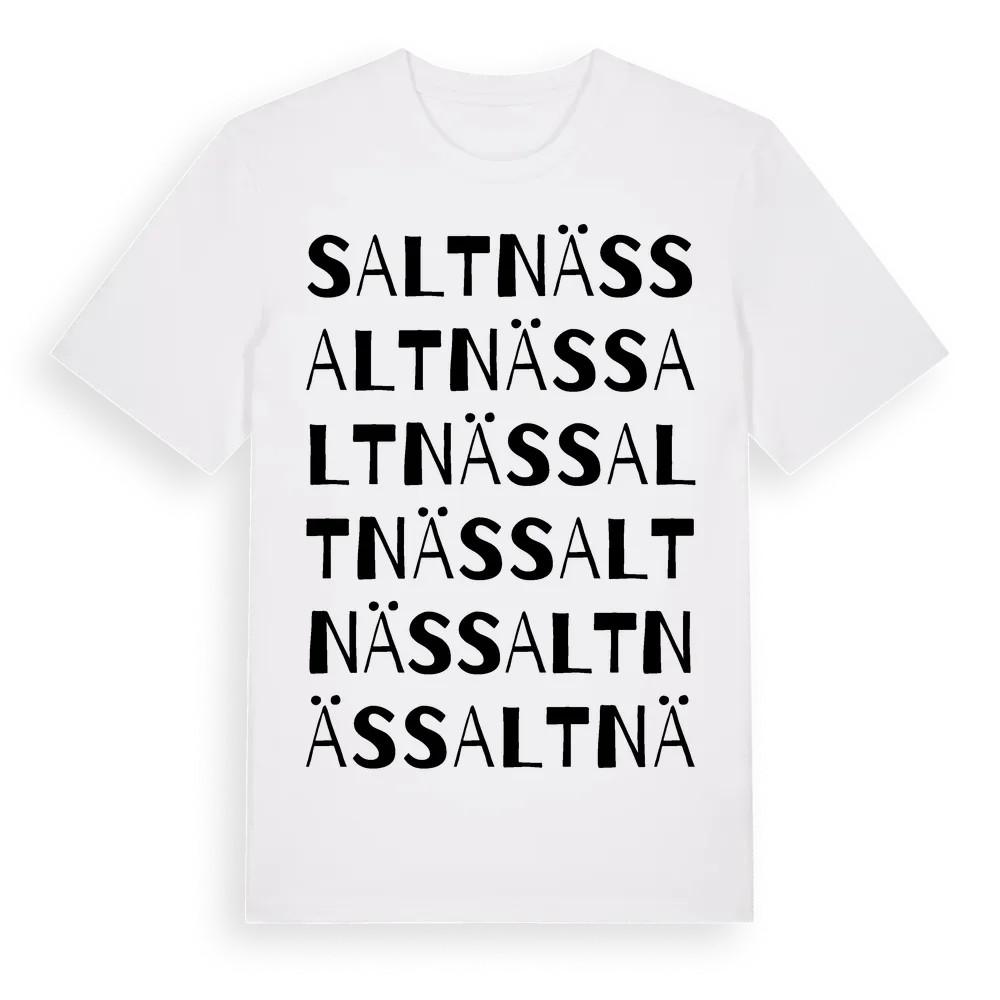 Saltnäs ordlek t-shirt är inspirerad av Saltnäs i Stockholms län, Sverige. Tröjan är designad för dig som har en speciell koppling till platsen – oavsett om du bor här, har rötterna här eller bara älskar Saltnäs.
