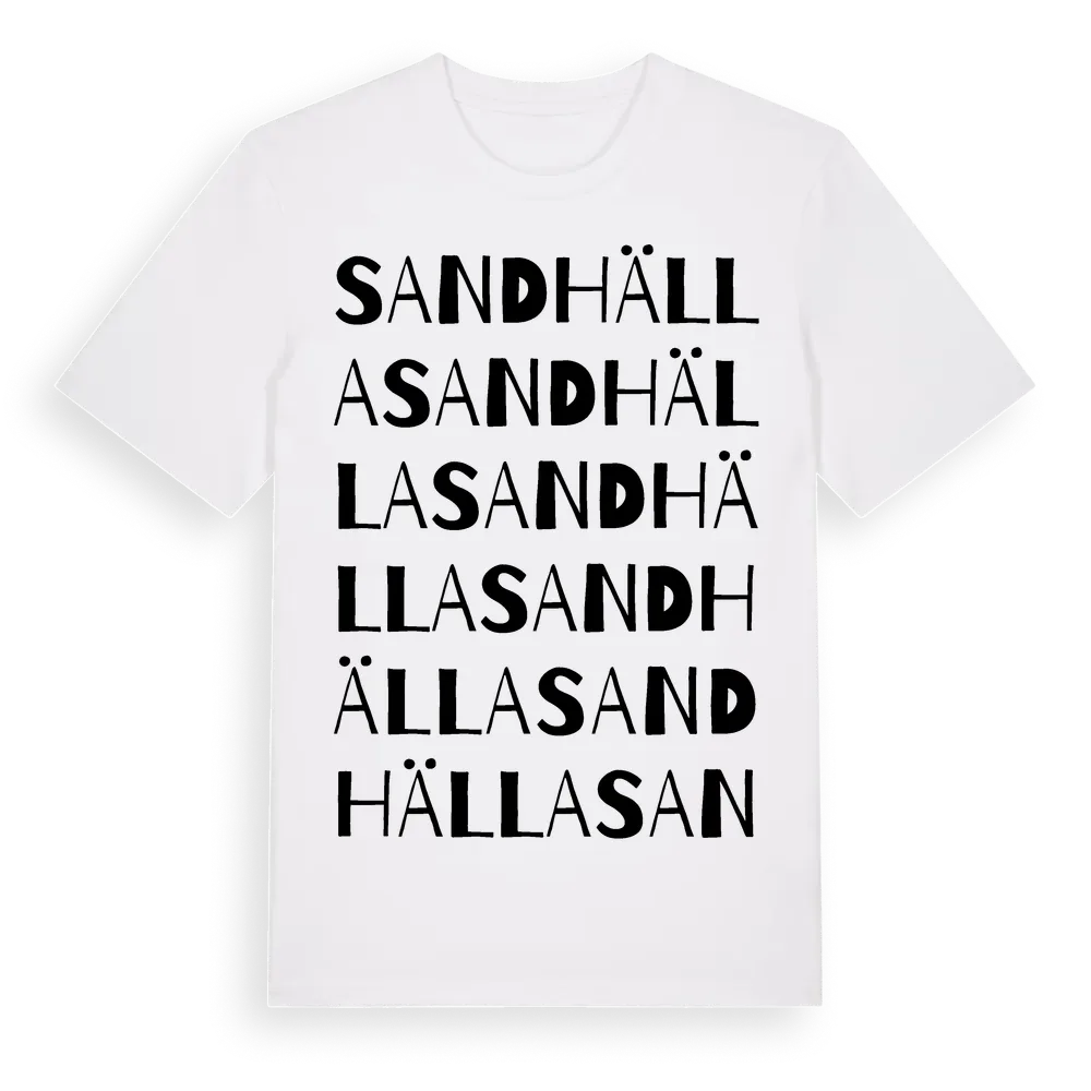 Sandhälla ordlek t-shirt är inspirerad av byn Sandhälla i Stockholms län, Sverige. Tröjan är designad för dig som har en speciell koppling till platsen – oavsett om du bor här, har rötterna här eller bara älskar Sandhälla.