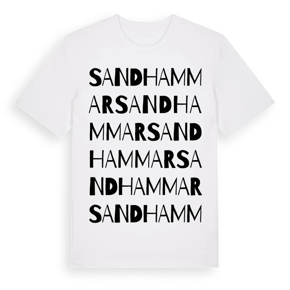 Sandhammar ordlek t-shirt är inspirerad av Sandhammar i Stockholms län, Sverige. Tröjan är designad för dig som har en speciell koppling till platsen – oavsett om du bor här, har rötterna här eller bara älskar Sandhammar.