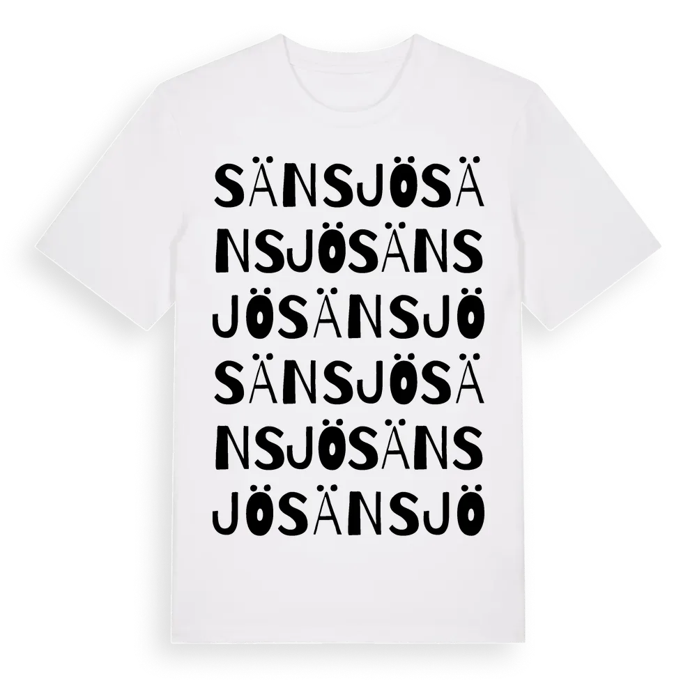 Sänsjö ordlek t-shirt är inspirerad av byn Sänsjö i Stockholms län, Sverige. Tröjan är designad för dig som har en speciell koppling till platsen – oavsett om du bor här, har rötterna här eller bara älskar Sänsjö.