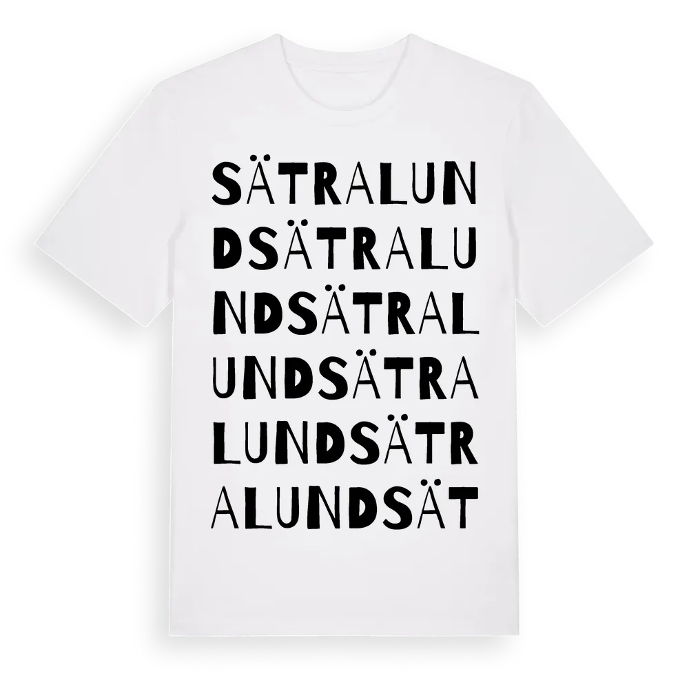 Sätralund ordlek t-shirt är inspirerad av Sätralund i Stockholms län, Sverige. Tröjan är designad för dig som har en speciell koppling till platsen – oavsett om du bor här, har rötterna här eller bara älskar Sätralund.