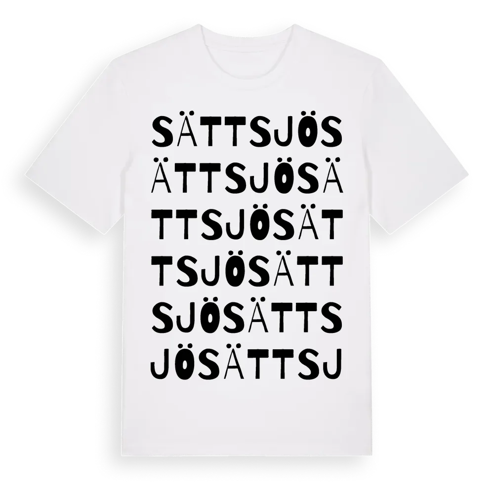 Sättsjö ordlek t-shirt är inspirerad av Sättsjö i Stockholms län, Sverige. Tröjan är designad för dig som har en speciell koppling till platsen – oavsett om du bor här, har rötterna här eller bara älskar Sättsjö.