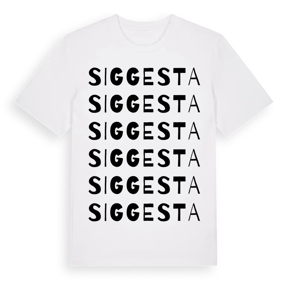 En ordlek byggd på Siggestas namn. Subtilt och klurig – ett motiv som bara de som verkligen känner platsen fullt ut förstår. Premium bomull, unisex – från byn Siggesta i Stockholms län.