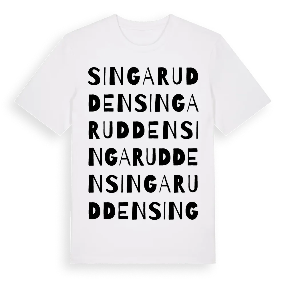 En ordlek byggd på Singaruddens namn. Subtilt och klurig – ett motiv som bara de som verkligen känner platsen fullt ut förstår. Premium bomull, unisex – från byn Singarudden i Stockholms län.