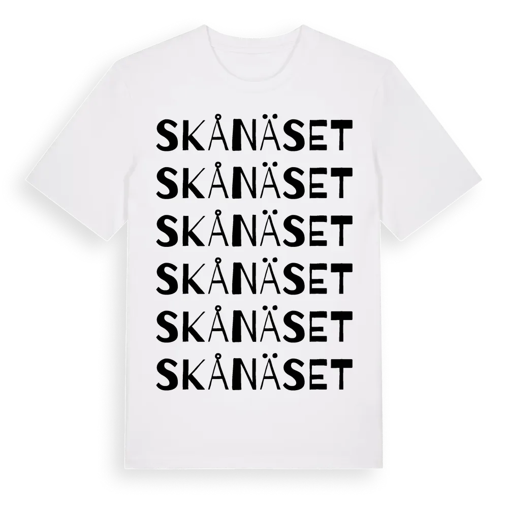 Skånäset ordlek t-shirt är inspirerad av Skånäset i Stockholms län, Sverige. Tröjan är designad för dig som har en speciell koppling till platsen – oavsett om du bor här, har rötterna här eller bara älskar Skånäset.