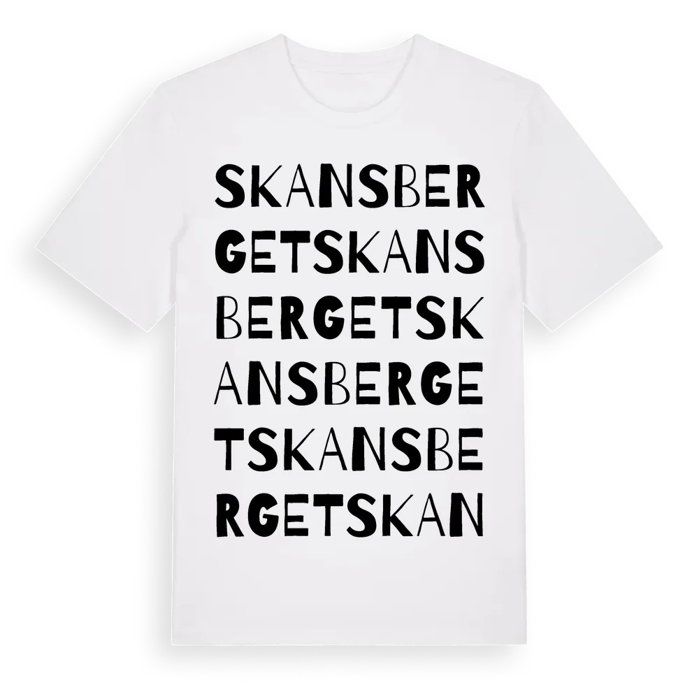 Skansberget ordlek t-shirt är inspirerad av Skansberget i Stockholms län, Sverige. Tröjan är designad för dig som har en speciell koppling till platsen – oavsett om du bor här, har rötterna här eller bara älskar Skansberget.