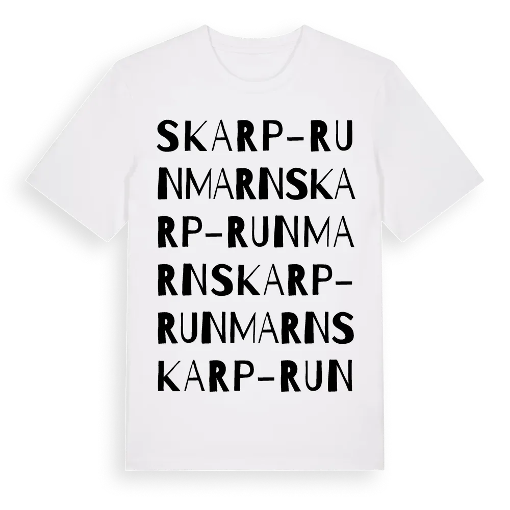 En ordlek byggd på Skarp-Runmarns namn. Subtilt och klurig – ett motiv som bara de som verkligen känner platsen fullt ut förstår. Premium bomull, unisex – från ön Skarp-Runmarn i Stockholms län.