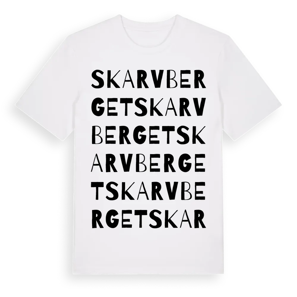 Skarvberget ordlek t-shirt är inspirerad av Skarvberget i Stockholms län, Sverige. Tröjan är designad för dig som har en speciell koppling till platsen – oavsett om du bor här, har rötterna här eller bara älskar Skarvberget.