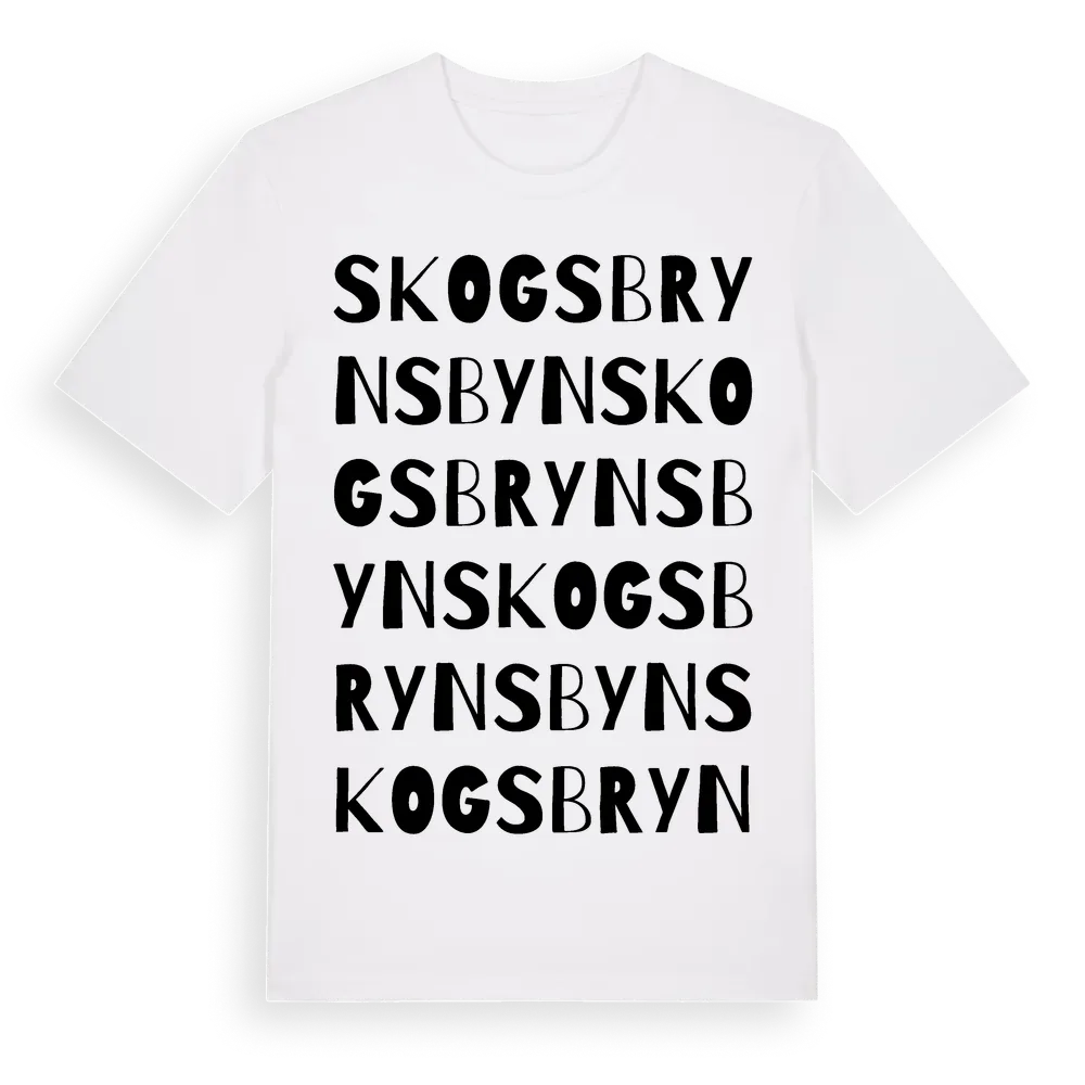 Skogsbrynsbyn ordlek t-shirt är inspirerad av stadsdelen Skogsbrynsbyn i Stockholms län, Sverige. Tröjan är designad för dig som har en speciell koppling till platsen – oavsett om du bor här, har rötterna här eller bara älskar Skogsbrynsbyn.