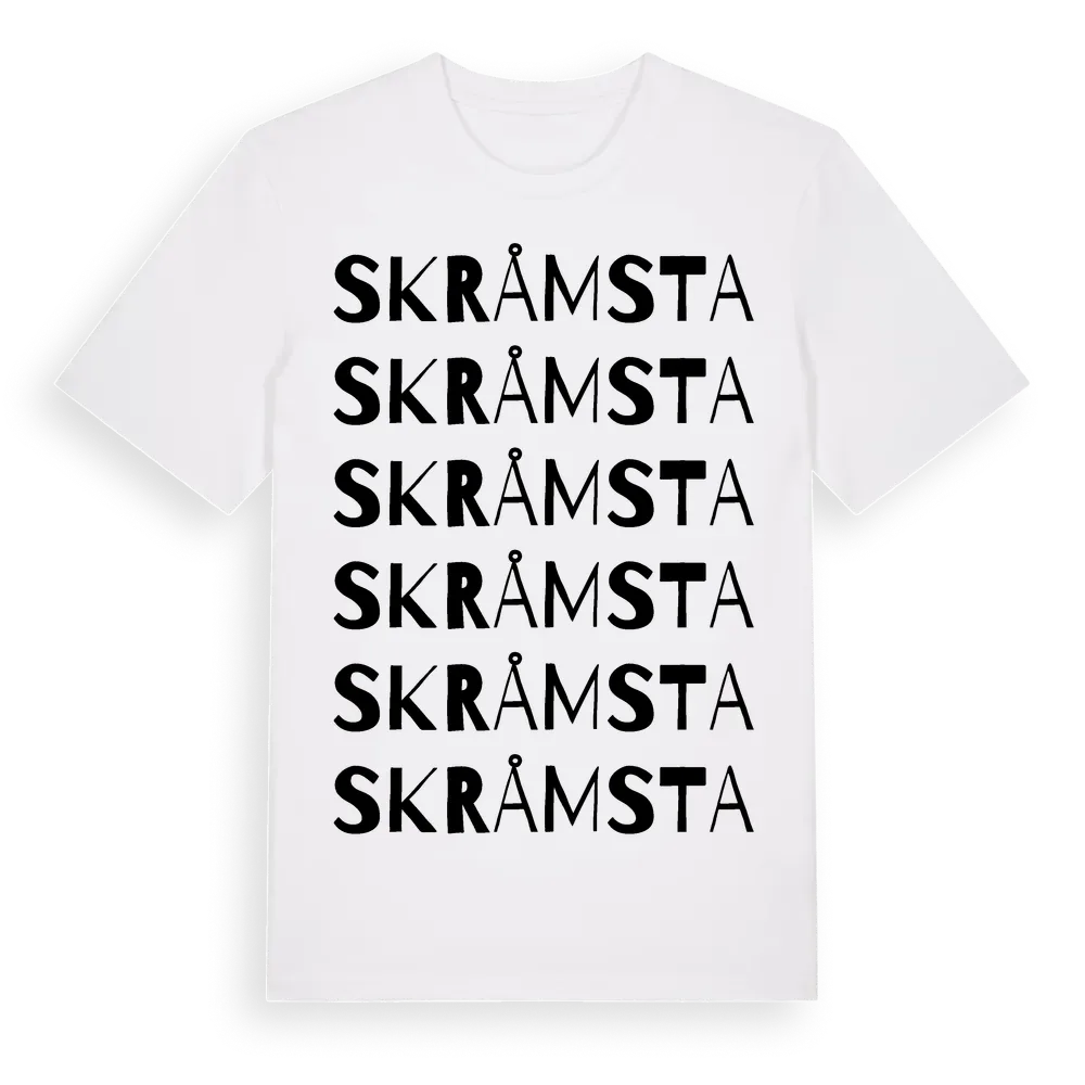En ordlek byggd på Skråmstas namn. Subtilt och klurig – ett motiv som bara de som verkligen känner platsen fullt ut förstår. Premium bomull, unisex – från Skråmsta i Stockholms län.