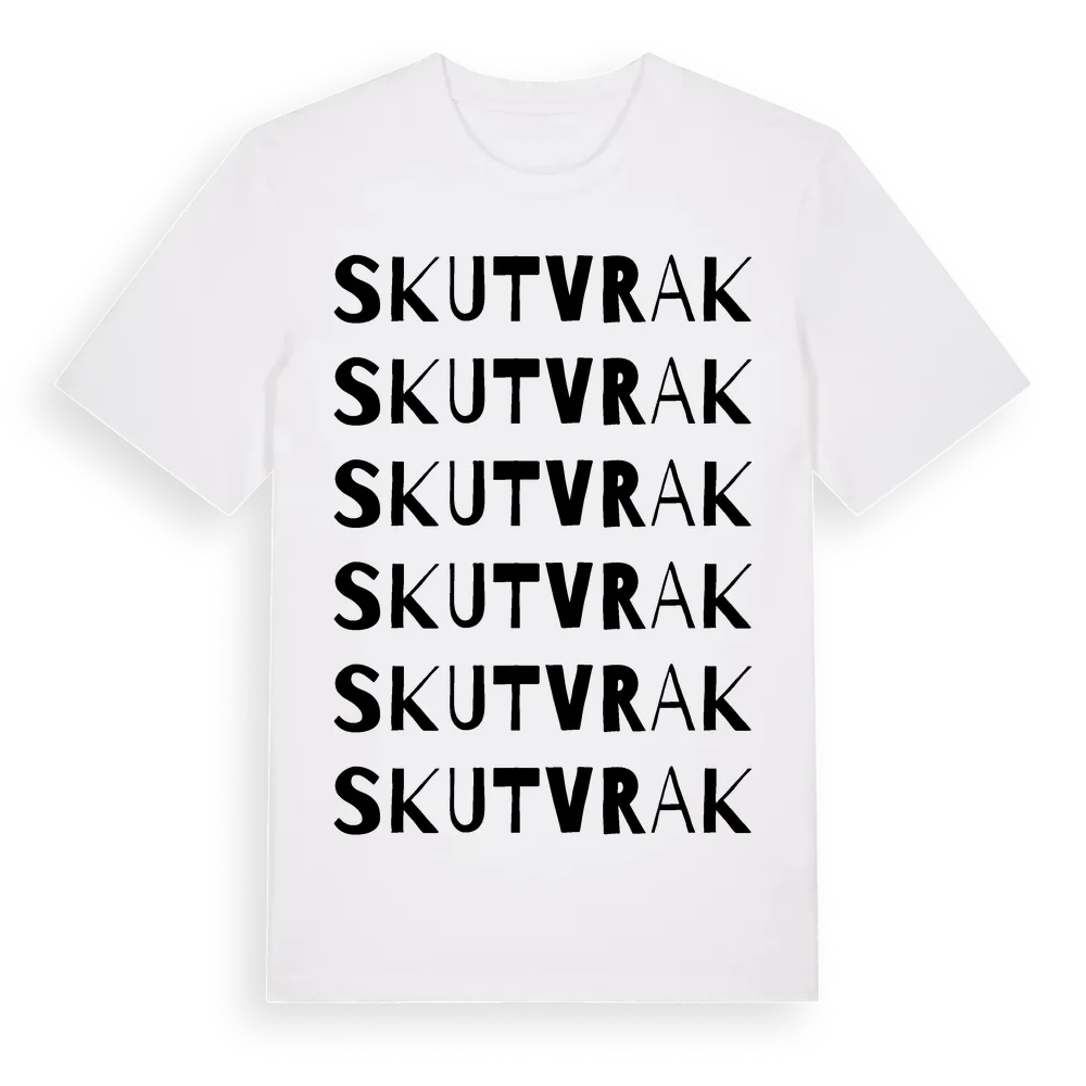 Skutvrak ordlek t-shirt är inspirerad av byn Skutvrak i Stockholms län, Sverige. Tröjan är designad för dig som har en speciell koppling till platsen – oavsett om du bor här, har rötterna här eller bara älskar Skutvrak.