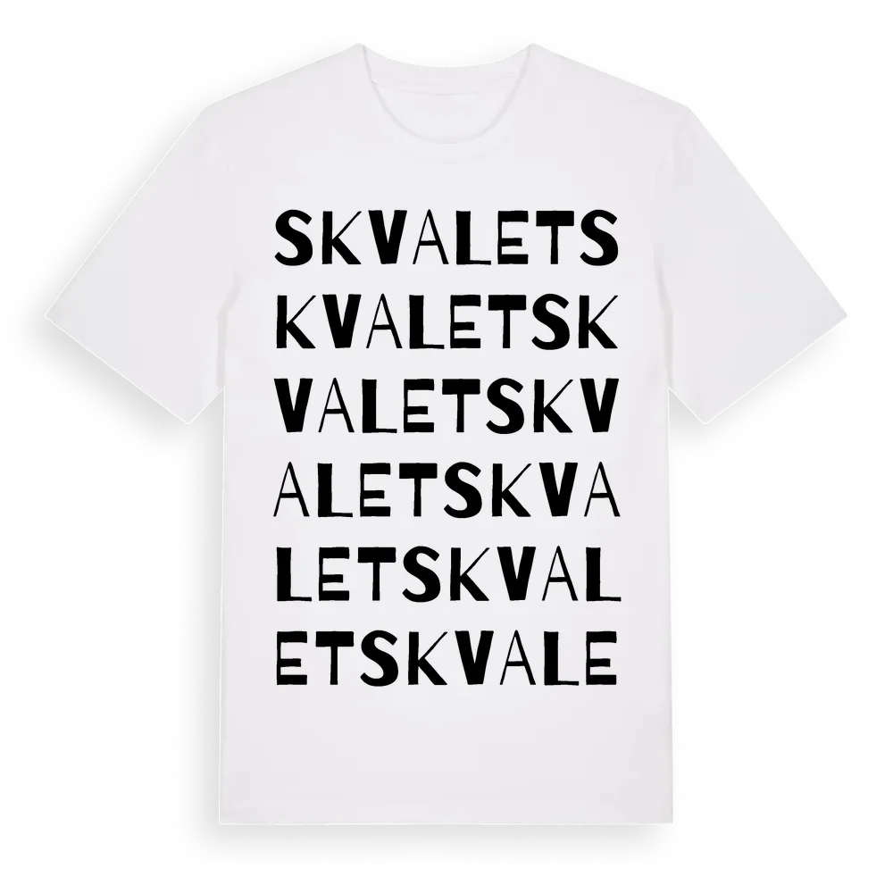 Skvalet ordlek t-shirt är inspirerad av Skvalet i Stockholms län, Sverige. Tröjan är designad för dig som har en speciell koppling till platsen – oavsett om du bor här, har rötterna här eller bara älskar Skvalet.