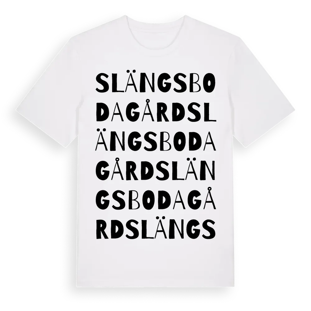 Slängsboda Gård ordlek t-shirt är inspirerad av Slängsboda Gård i Stockholms län, Sverige. Tröjan är designad för dig som har en speciell koppling till platsen – oavsett om du bor här, har rötterna här eller bara älskar Slängsboda Gård.