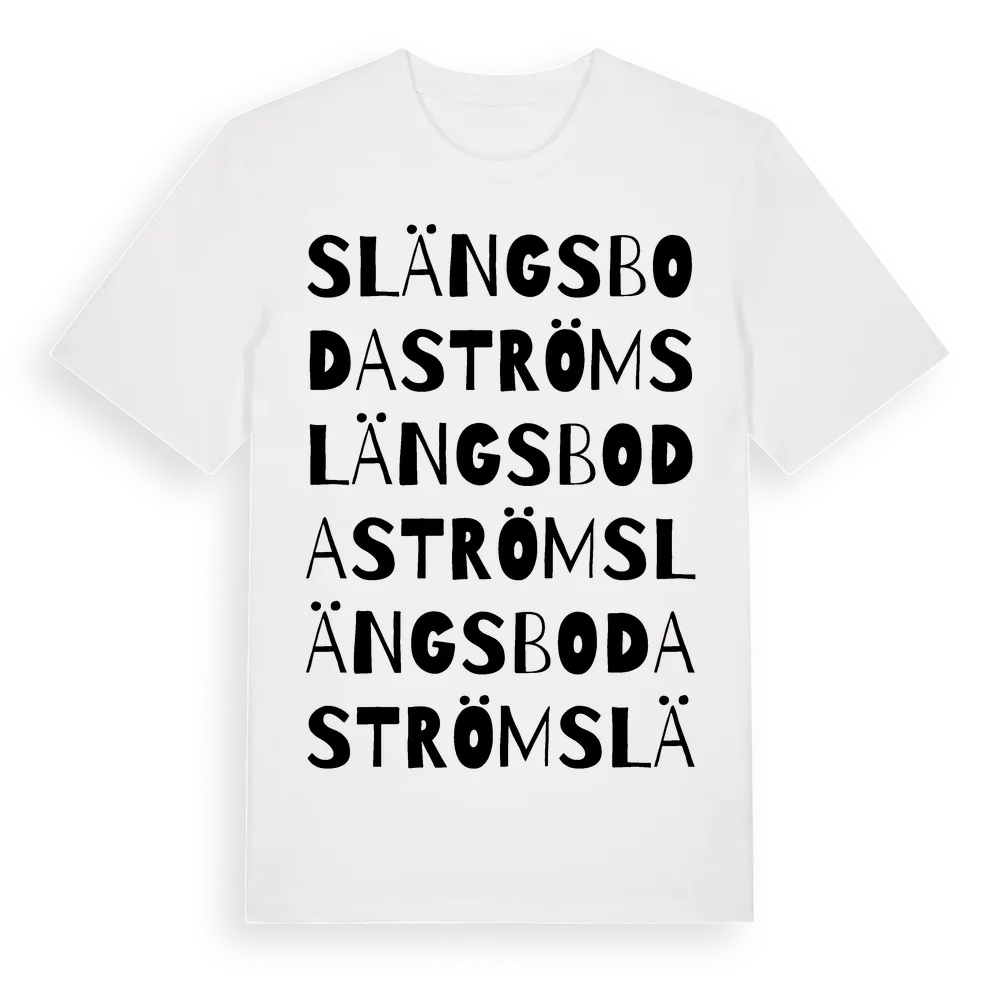 Slängsboda Ström ordlek t-shirt är inspirerad av byn Slängsboda Ström i Stockholms län, Sverige. Tröjan är designad för dig som har en speciell koppling till platsen – oavsett om du bor här, har rötterna här eller bara älskar Slängsboda Ström.