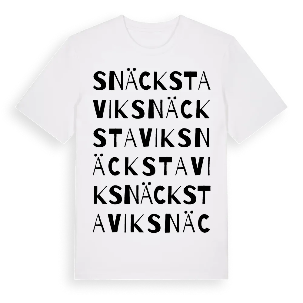Snäckstavik ordlek t-shirt är inspirerad av byn Snäckstavik i Stockholms län, Sverige. Tröjan är designad för dig som har en speciell koppling till platsen – oavsett om du bor här, har rötterna här eller bara älskar Snäckstavik.
