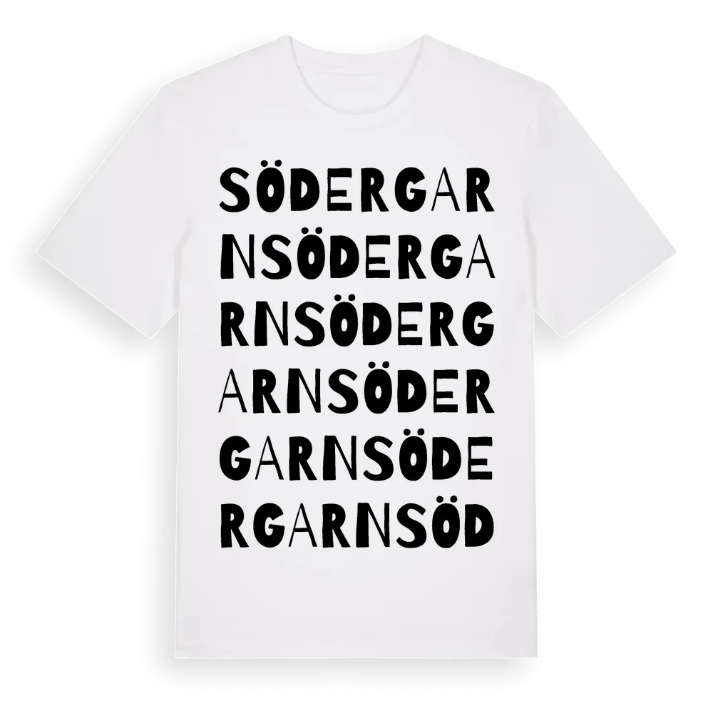 Södergarn ordlek t-shirt är inspirerad av Södergarn i Stockholms län, Sverige. Tröjan är designad för dig som har en speciell koppling till platsen – oavsett om du bor här, har rötterna här eller bara älskar Södergarn.