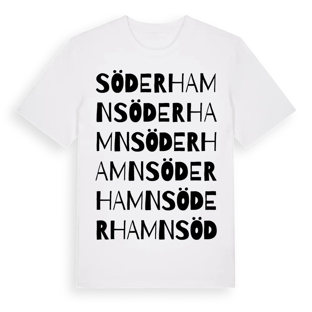 Söderhamn ordlek t-shirt är inspirerad av Söderhamn i Stockholms län, Sverige. Tröjan är designad för dig som har en speciell koppling till platsen – oavsett om du bor här, har rötterna här eller bara älskar Söderhamn.
