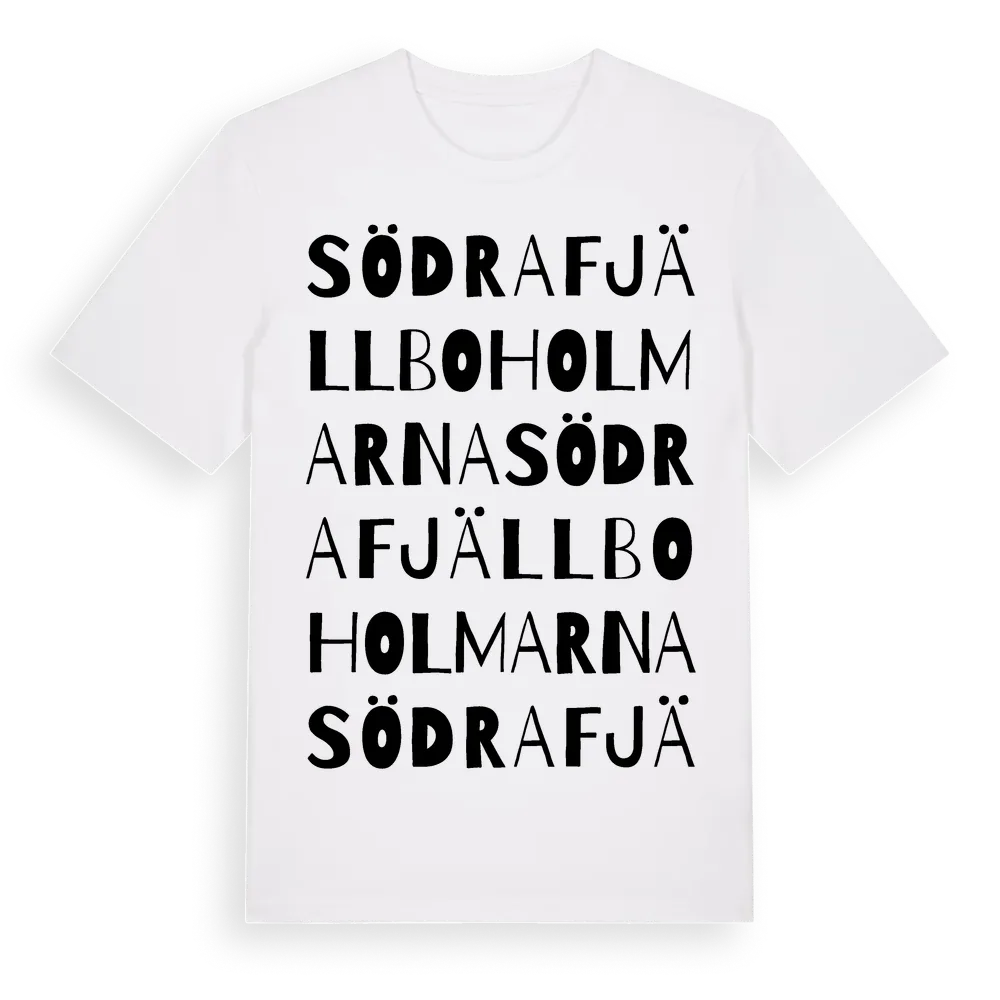 Södra Fjällboholmarna ordlek t-shirt är inspirerad av byn Södra Fjällboholmarna i Stockholms län, Sverige. Tröjan är designad för dig som har en speciell koppling till platsen – oavsett om du bor här, har rötterna här eller bara älskar Södra Fjällboholmarna.
