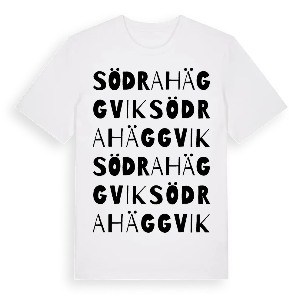 Södra Häggvik ordlek t-shirt är inspirerad av stadsdelen Södra Häggvik i Stockholms län, Sverige. Tröjan är designad för dig som har en speciell koppling till platsen – oavsett om du bor här, har rötterna här eller bara älskar Södra Häggvik.