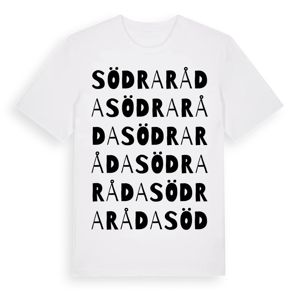 Södra Råda ordlek t-shirt är inspirerad av byn Södra Råda i Stockholms län, Sverige. Tröjan är designad för dig som har en speciell koppling till platsen – oavsett om du bor här, har rötterna här eller bara älskar Södra Råda.