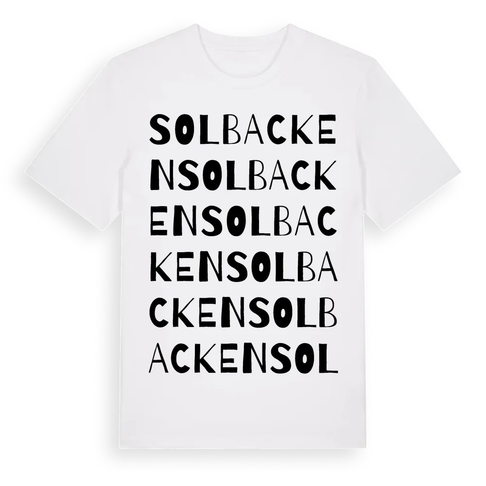 Solbacken ordlek t-shirt är inspirerad av Solbacken i Stockholms län, Sverige. Tröjan är designad för dig som har en speciell koppling till platsen – oavsett om du bor här, har rötterna här eller bara älskar Solbacken.