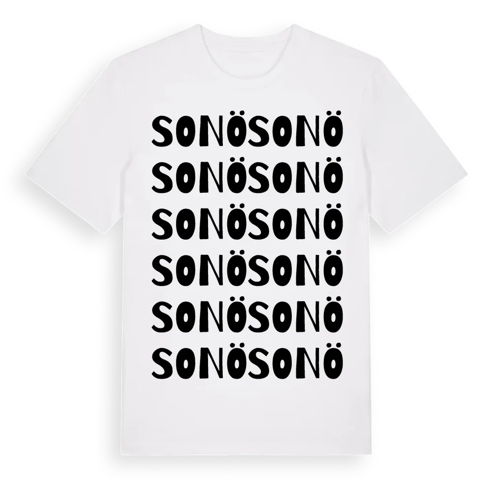 En ordlek byggd på Sonös namn. Subtilt och klurig – ett motiv som bara de som verkligen känner platsen fullt ut förstår. Premium bomull, unisex – från byn Sonö i Stockholms län.