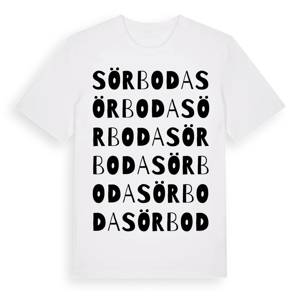 Sörboda ordlek t-shirt är inspirerad av Sörboda i Stockholms län, Sverige. Tröjan är designad för dig som har en speciell koppling till platsen – oavsett om du bor här, har rötterna här eller bara älskar Sörboda.