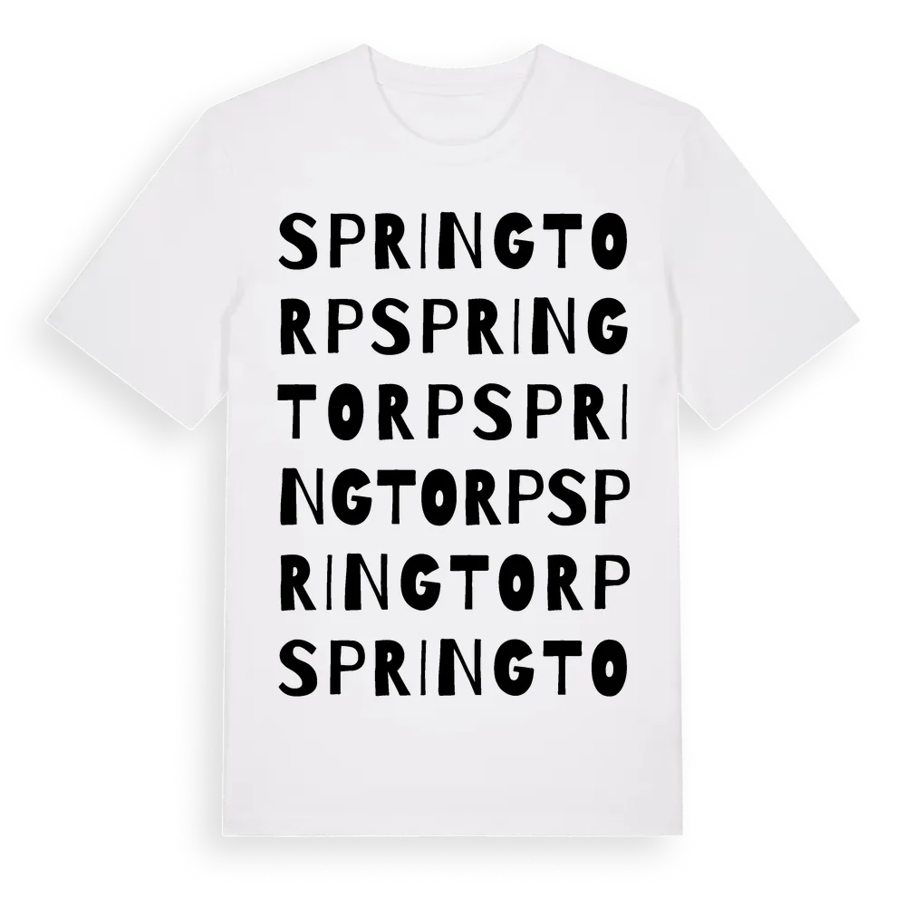 En ordlek byggd på Springtorps namn. Subtilt och klurig – ett motiv som bara de som verkligen känner platsen fullt ut förstår. Premium bomull, unisex – från Springtorp i Stockholms län.