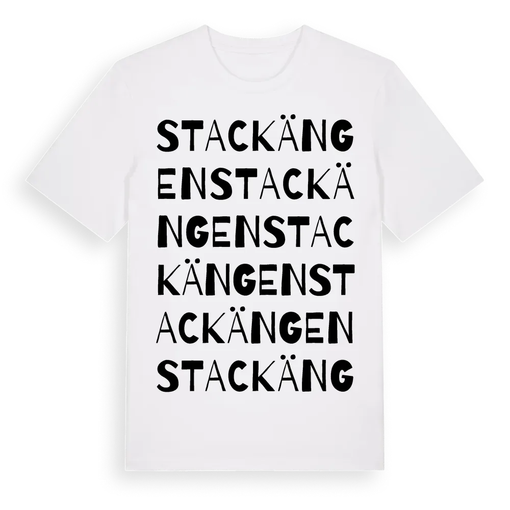 En ordlek byggd på Stackängens namn. Subtilt och klurig – ett motiv som bara de som verkligen känner platsen fullt ut förstår. Premium bomull, unisex – från byn Stackängen i Stockholms län.
