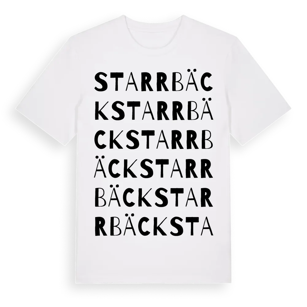 Starrbäck ordlek t-shirt är inspirerad av Starrbäck i Stockholms län, Sverige. Tröjan är designad för dig som har en speciell koppling till platsen – oavsett om du bor här, har rötterna här eller bara älskar Starrbäck.