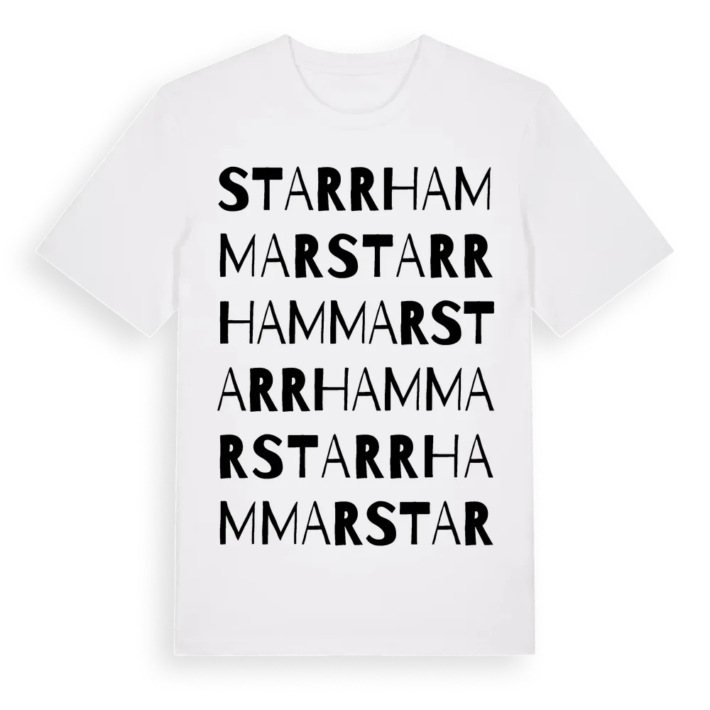 Starrhammar ordlek t-shirt är inspirerad av Starrhammar i Stockholms län, Sverige. Tröjan är designad för dig som har en speciell koppling till platsen – oavsett om du bor här, har rötterna här eller bara älskar Starrhammar.