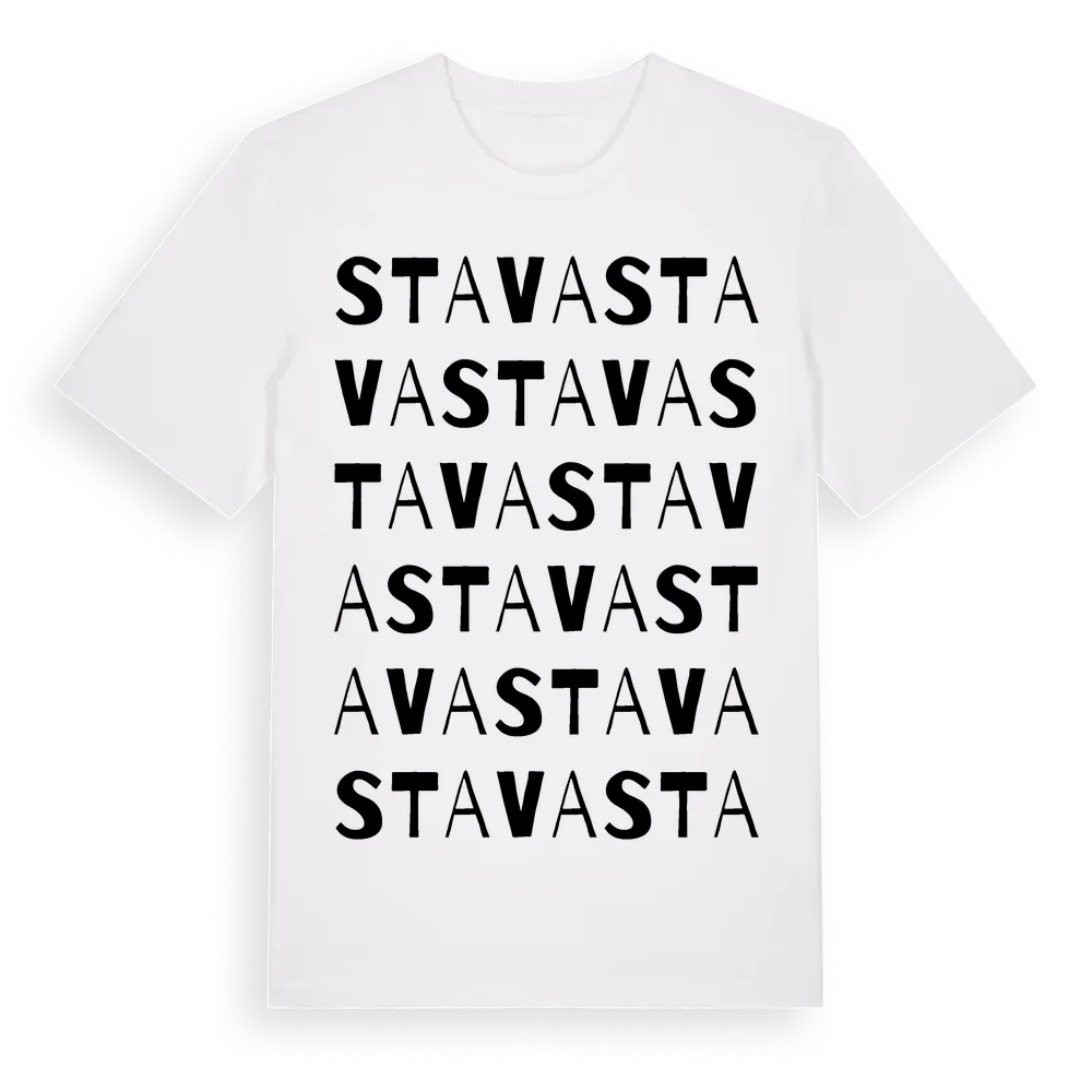 En ordlek byggd på Stavas namn. Subtilt och klurig – ett motiv som bara de som verkligen känner platsen fullt ut förstår. Premium bomull, unisex – från byn Stava i Stockholms län.