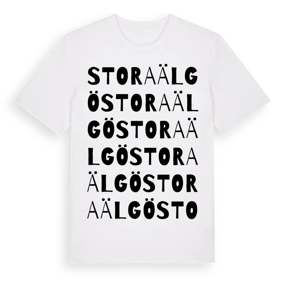 En ordlek byggd på Stora Älgös namn. Subtilt och klurig – ett motiv som bara de som verkligen känner platsen fullt ut förstår. Premium bomull, unisex – från ön Stora Älgö i Stockholms län.